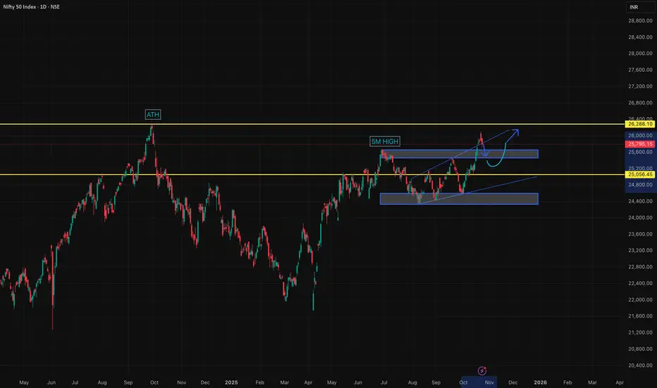 The Nifty 50 has demonstrated significant strength, rallying approximately 6% over the last three weeks to trade around 25797, just shy of the recent high of 26104. This extended upward movement, however, creates a fertile ground for a short-term correction, aligning with a moderately bearish view for the coming weeks.