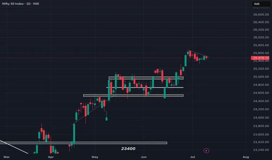 As expected NIFTY got rejected exactly from our given trendline resistance but since it tried breaking the trednline, its candle high is of immense importance. Any break and sustainment above 25550 can result in strong unidirectional upmove, but below the trendline, it can remain sideways to negative so plan your trades accordingly and keep watching everyone.
