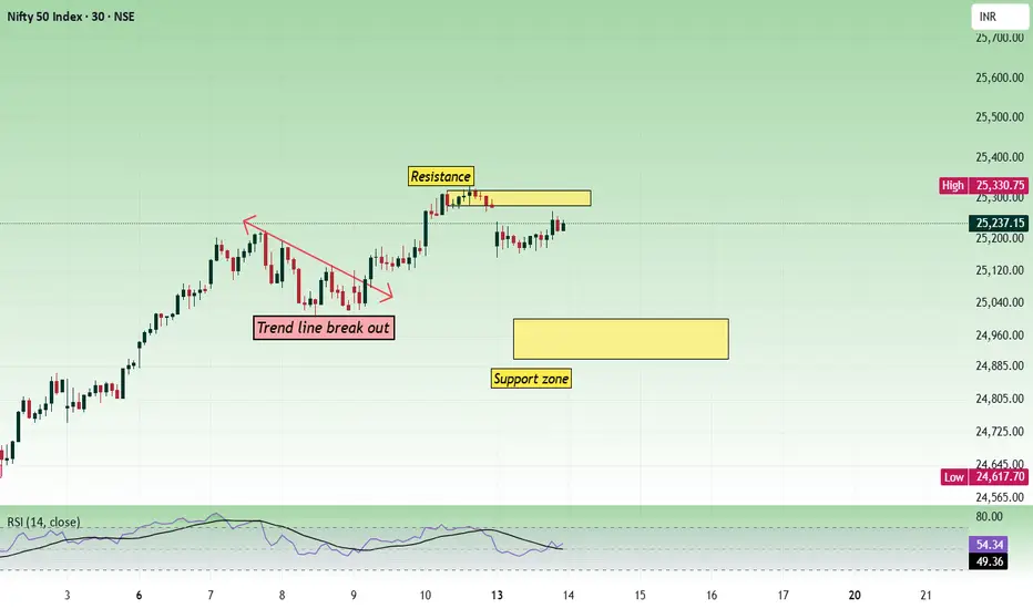 Price moved within a very narrow range today between 25150 and 25250. Nearby resistance is seen at the 25300 - 25320 zone. And nearby support is at the 25000 zone. Bank Nifty was bullish and did not fall, giving strength to Nifty to sustain above 25150.