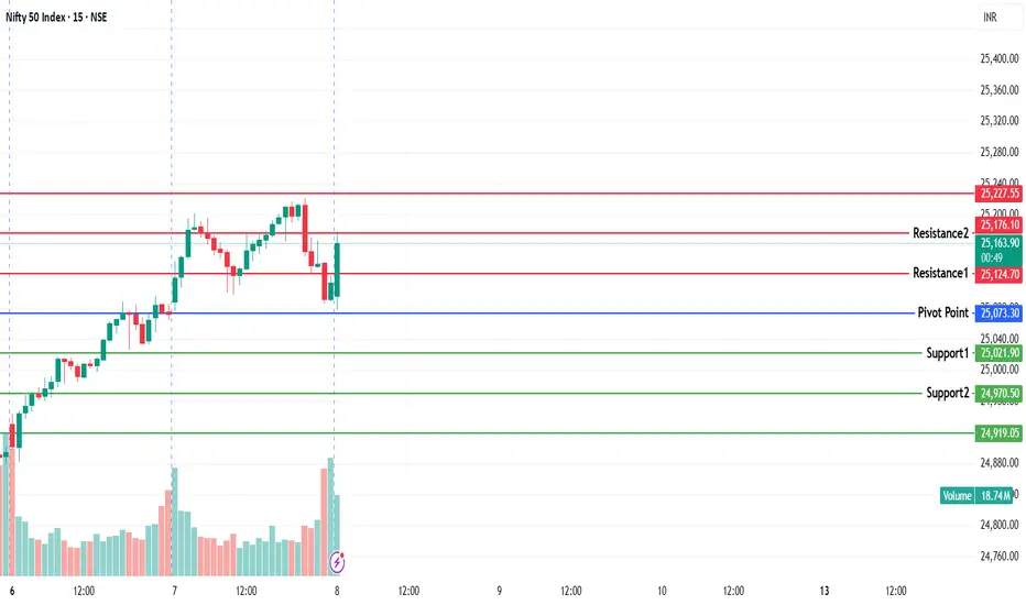 If the candle stays above the pivot point, it is considered a bullish bias; if it remains below, it indicates a bearish bias. Price may reverse near Resistance 1 or Support 1. If it moves further, the next potential reversal zone is near Resistance 2 or Support 2. If these levels are also broken, we can expect the trend.