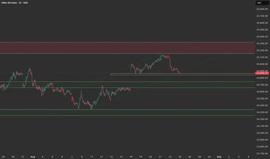 Structure: Demand wicks visible at 24,850 but no strong reversal yet.