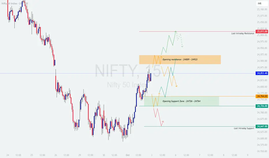 - [] A flat start near 24,800 – 24,850 will keep Nifty between its Opening Resistance Zone (24,889 – 24,923) and Opening Support Zone (24,726 – 24,764).