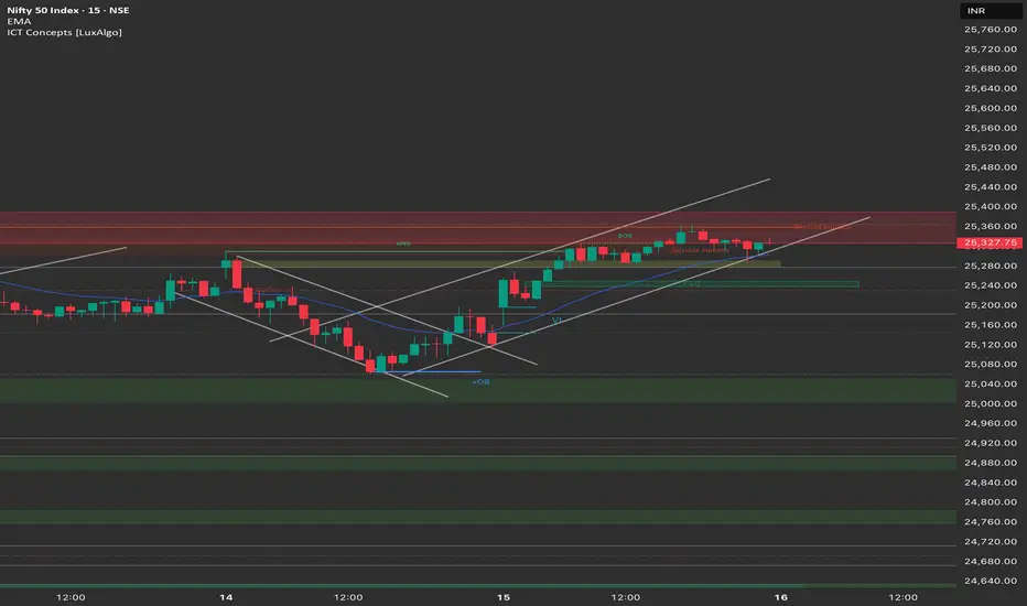 Structure: The 1H chart shows a clear Market Structure Shift (MSS) back to the upside. The price broke the immediate swing high after defending the 25,050 level. The index closed strongly within its ascending channel.