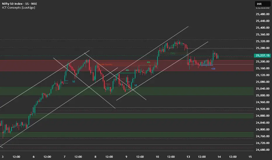 Immediate Support: 25,150 (The area where the price consolidated on Monday, and a current Order Block/Demand Zone).