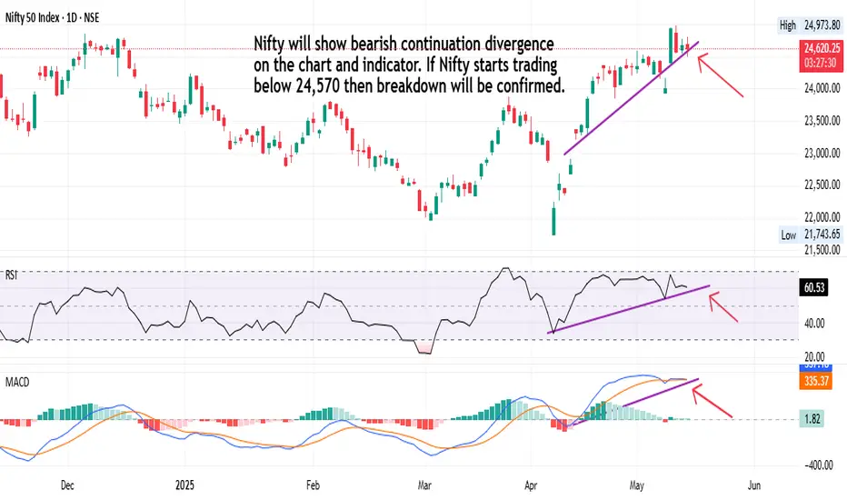 Nifty will show bearish continuation divergence on the chart and indicator. If Nifty starts trading below 24,570 then breakdown will be confirmed.