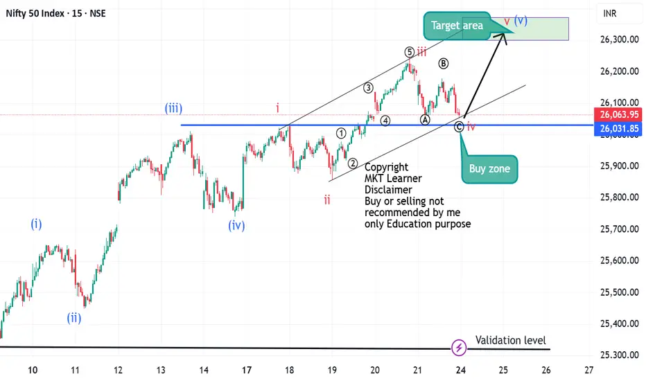 Wave (v)- internal structure i ii, iii have completed and wave iv in progress it may be ended near 26k here is buy setup generate for minuette degree wave (v) it may be anticipate around 26350 area.