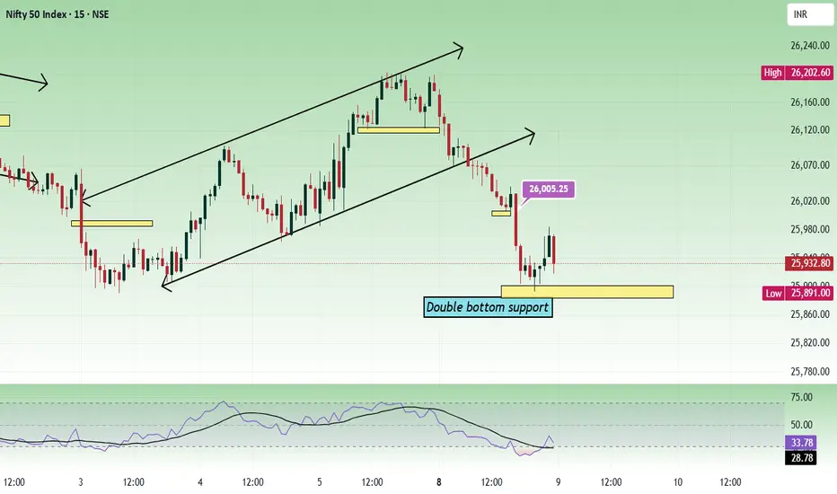 The price broke the channel and fall down towards the double bottom support at the 25900 zone. The price can move in this range 25800 to 26200 as per the higher(daily) and lower(15 minutes) chart analysis.