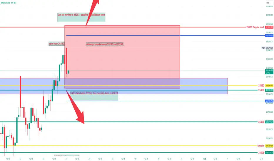 Consolidation likely between 25250 – 25293. Wait for a strong candle close above 25293 to buy for 25370.