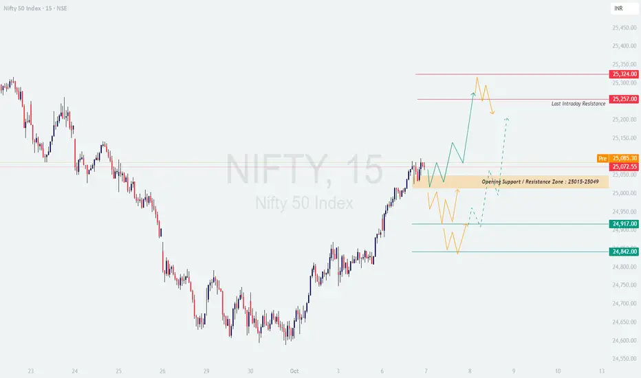 - [] A flat opening near 25,050 will keep Nifty inside the Opening Support/Resistance zone (25,015 – 25,049).