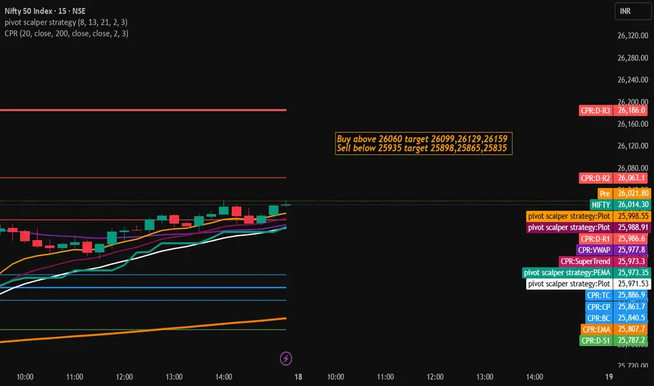 A strong 15-minute close above ₹26,060 indicates bullish momentum entering the market. This level acts as a breakout zone, and once crossed with confirmation, price may push toward the next resistance clusters of 99 / 129 / 159. Ideal setup for momentum buyers during trending sessions.
