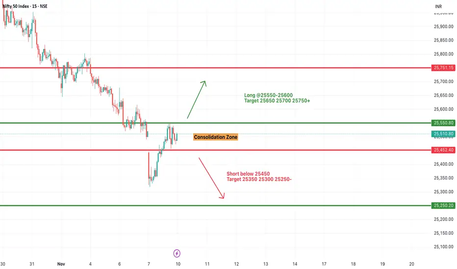 If Nifty sustains above 25,550–25,600, it may trigger a short-covering rally toward 25,650, 25,700, and 25,750+. A breakout above 25,750 could further strengthen the momentum and shift sentiment toward the bullish side.