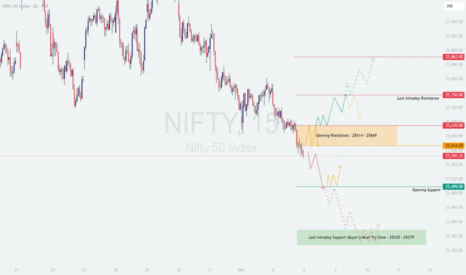 - [] A gap-down below 25,500 directly places the index near the Opening Support or Last Intraday Support zone (25,335 – 25,379).