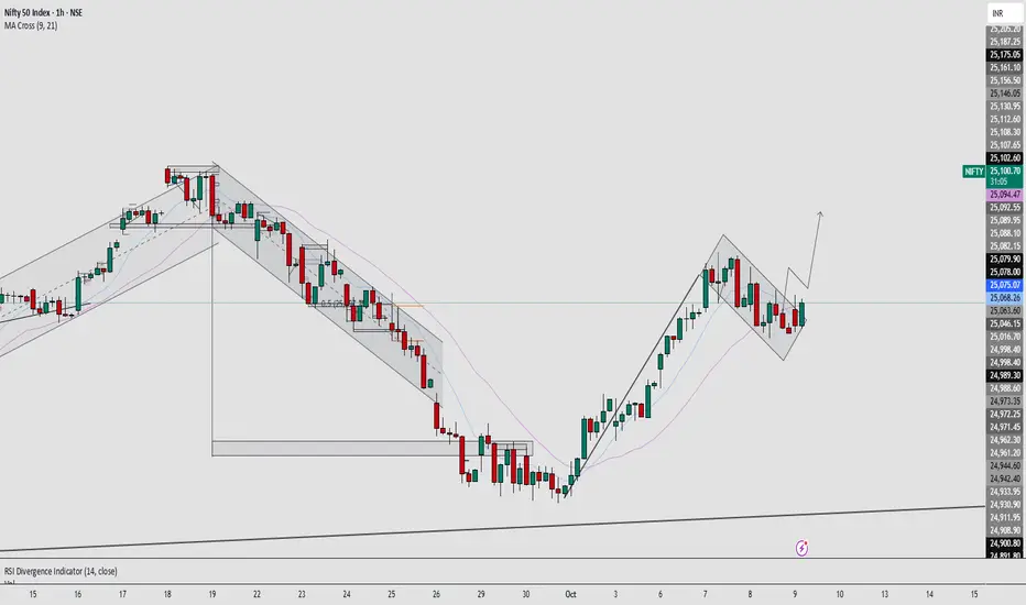 NIFTY 50 is showing a clean bullish flag breakout on the 1H chart after a strong impulsive leg from recent lows.