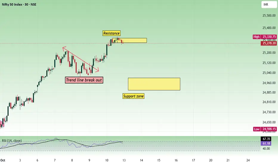 Price has been facing resistance at the 25320 zone and has been unable to break through it on Friday. If we have a gap-down opening due to the weakness in global markets, 24900 - 25000 can act as a support zone. 24900 to 25000 can become choppy if there is no trend strength. If the support is broken, the next support will be 24600.