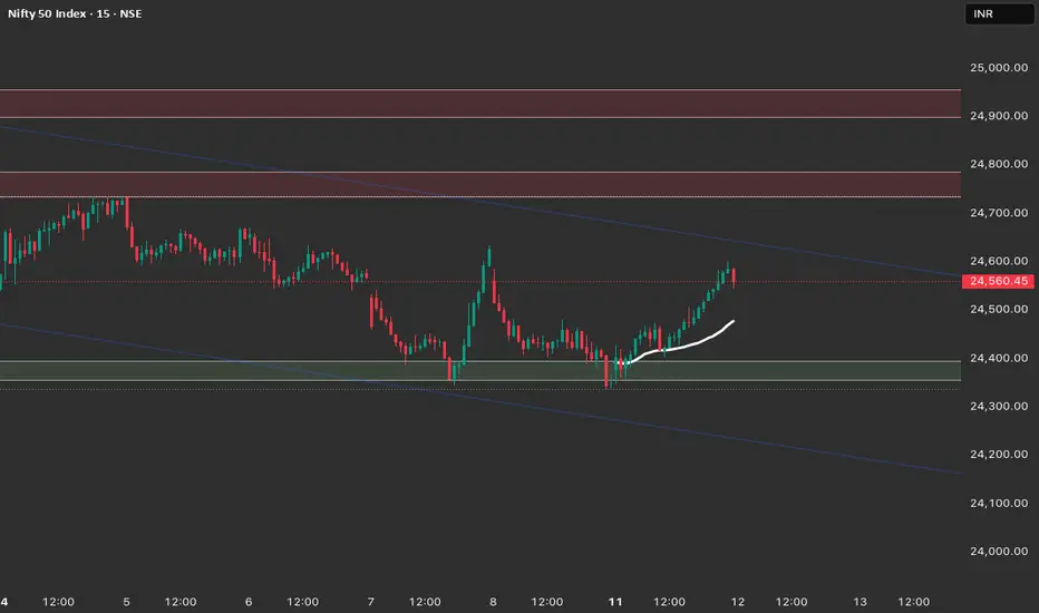 Still within the broader downtrend channel, but price has shown strength after a bounce from 24,350 demand zone.