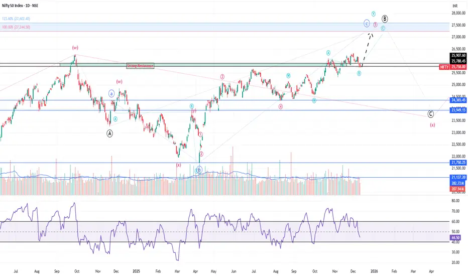 In wave 5 of c of b of X, Nifty is making wxy pattern. Wave w has been completed at 25153 and wave x at 24587 and heading towards internal wave y of wave 5.