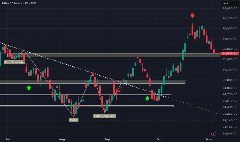 We are finally at our target exactly as analysed and our patience and belief in oneself did paid off. Now, following the global cues, we can still expect NIFTY to open weak and fall but we have to look at tomorrow's closing as it is not just a day's closing but also closing for the week. Now we keep our bearish bias on following our analysis which is aligning with our analysis unless signs of reversal is seen around 25500 so plan your trades accordingly and keep watching everyone.