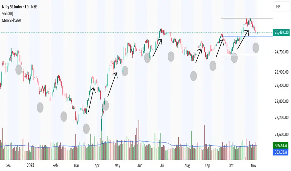 In short, moon phases aren't a crystal ball but offer a quirky lens on human irrationality in markets. If you're intrigued, overlay them on charts (e.g., via tools like TradingView) alongside fundamentals—but treat it as a tiebreaker, not gospel. For October 24, 2025 (waxing crescent, ~9% illuminated), studies suggest mild optimism; watch for full moon volatility on November 5