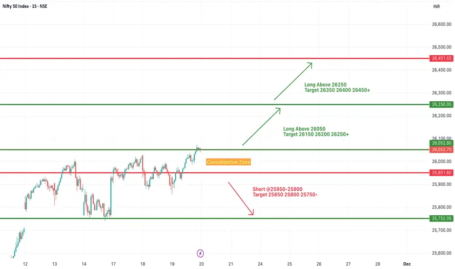Nifty is expected to open with a gap-up, indicating continued bullish sentiment and strength above the immediate consolidation zone. If the index sustains above the 26050 level after the opening, it will activate the long trade setup with upside targets of 26150, 26200, and 26250+. A further breakout above 26250 may fuel the next bullish leg toward 26350, 26400, and 26450+.