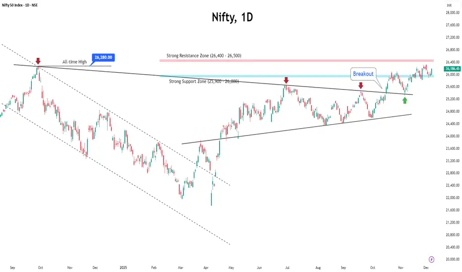 On the upside, the index faces a strong resistance around 26,400–26,500, which will be crucial to watch. A breakout above this could unlock further strength.