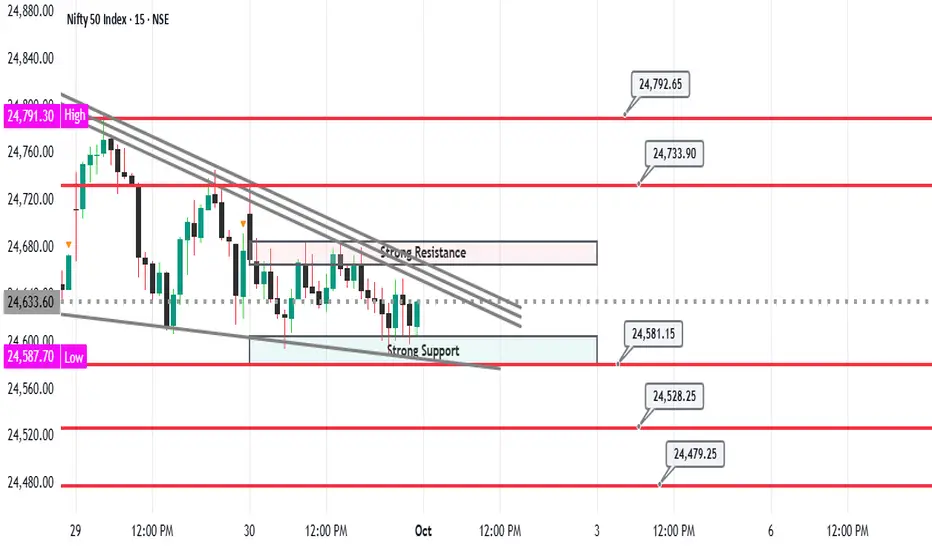 24700 and 24580 are acting as strong resistance and support until these zones are broken we will see market in sideways zone. Market is following the trendlines to the point. This is start of weekly expiry so we can expect both sides moves today. Let the resistance or support break with a 5 minutes candles then look for trades.