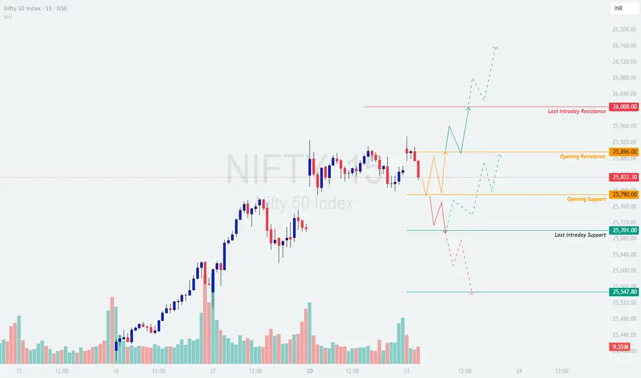 Reference from your map: Opening Resistance 25,896; Opening Support 25,790; Last Intraday Support 25,701 and deeper support 25,548; overhead resistance 26,008. Bias is neutral-to-positive while above 25,790; momentum unlocks only on acceptance above 25,896, whereas sustained loss of 25,701 flips control to bears. 🚦