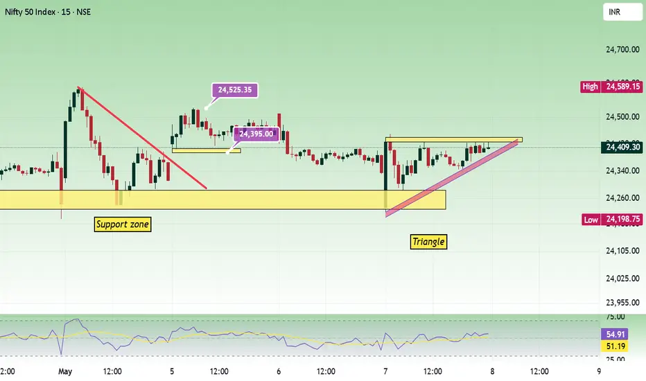 Today also we had a narrow range movement day. Price has formed an ascending triangle in that process. Sustaining above 24400 is important to be bullish.