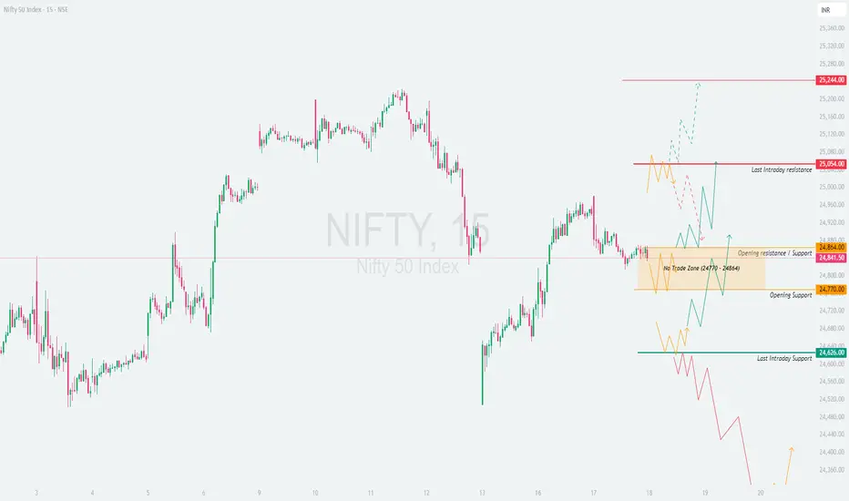 If NIFTY opens above the No Trade Zone (24,864) by more than 100 points, the price will likely test the upper resistance zone near 25,054 (Last Intraday Resistance).