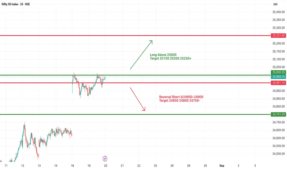 On the contrary, if Nifty fails to hold above 25,000 and starts trading below 24,950–24,900, then a reversal short setup may get activated. In such a case, downside levels of 24,850, 24,800, and 24,750 could be tested, and weakness may extend further if selling pressure increases.