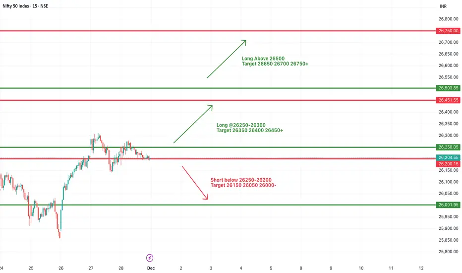 A clear breakout above the psychological and technical resistance of 26500 could attract fresh buying momentum, opening the path toward higher targets at 26650, 26700, and even 26750+, especially if global cues support risk-on sentiment. In such a scenario, the market could experience a trend-driven rally with shallow pullbacks and continuous higher supports.