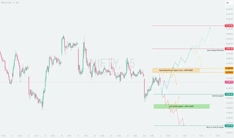 A gap-down below 24,592 indicates early weakness, and price may head towards the Last Intraday Support Zone (24,512 โ 24,474). The final buyer defense level rests at 24,337, tagged as the Must Try Level for Buyers.