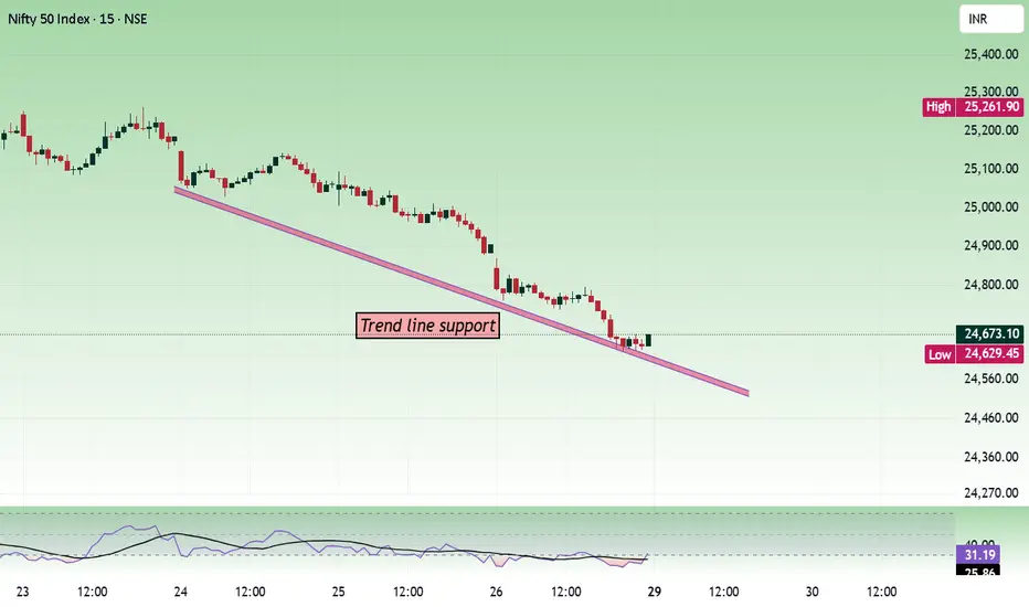 Price has been falling continuously for a few days. Nearby support levels are 24500 and 24350-24400 zone. We can expect more fall if the price breaks this level.