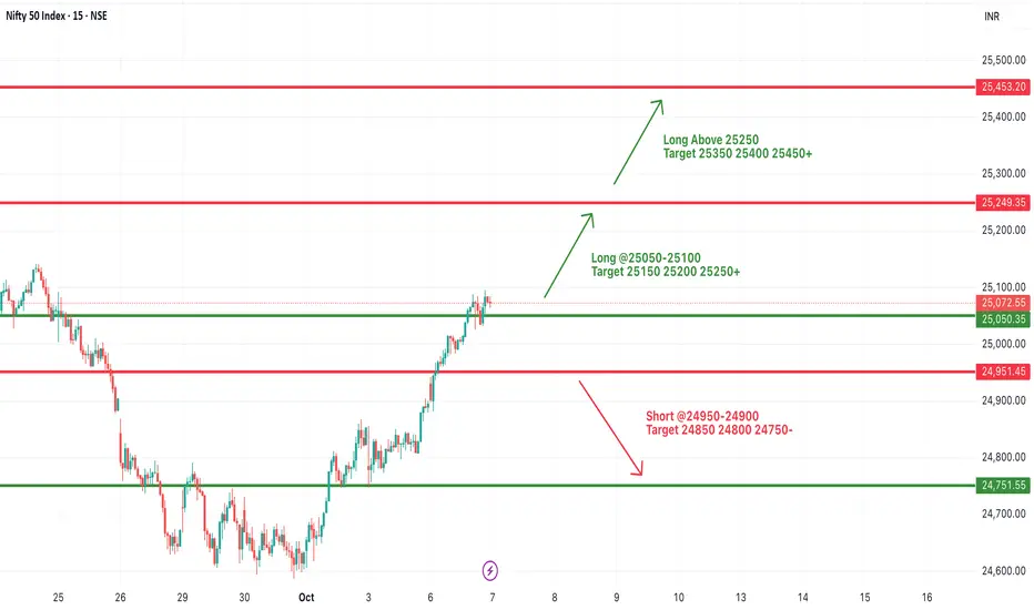 If Nifty sustains above 25,050–25,100, it can extend the rally toward 25,150, 25,200, and 25,250+. A breakout above 25,250 will further strengthen the bullish trend, potentially leading to higher targets near 25,350–25,450+.