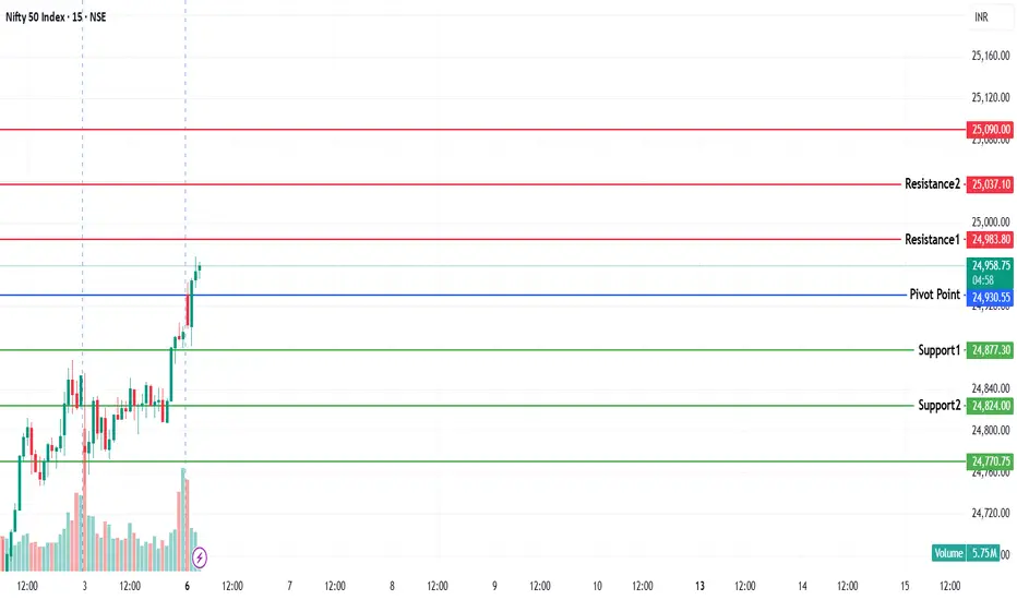 If the candle stays above the pivot point, it is considered a bullish bias; if it remains below, it indicates a bearish bias. Price may reverse near Resistance 1 or Support 1. If it moves further, the next potential reversal zone is near Resistance 2 or Support 2. If these levels are also broken, we can expect the trend.
