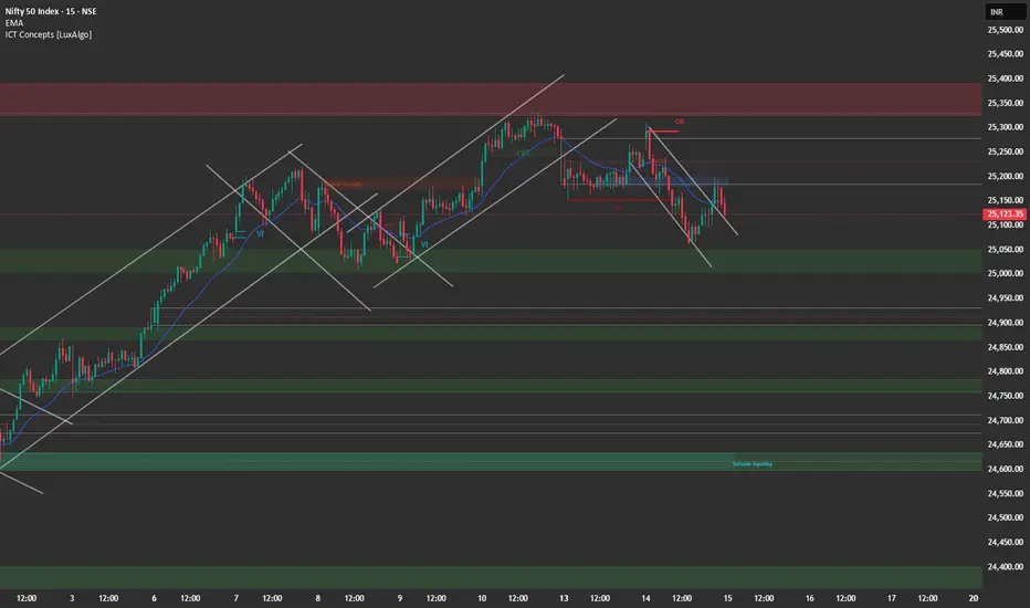 Structure: The 1H chart shows a clear Break of Structure (BOS) to the downside. The price sold off sharply after failing to sustain the move above 25,250, breaking the immediate swing low and closing below the lower trendline of the ascending channel.