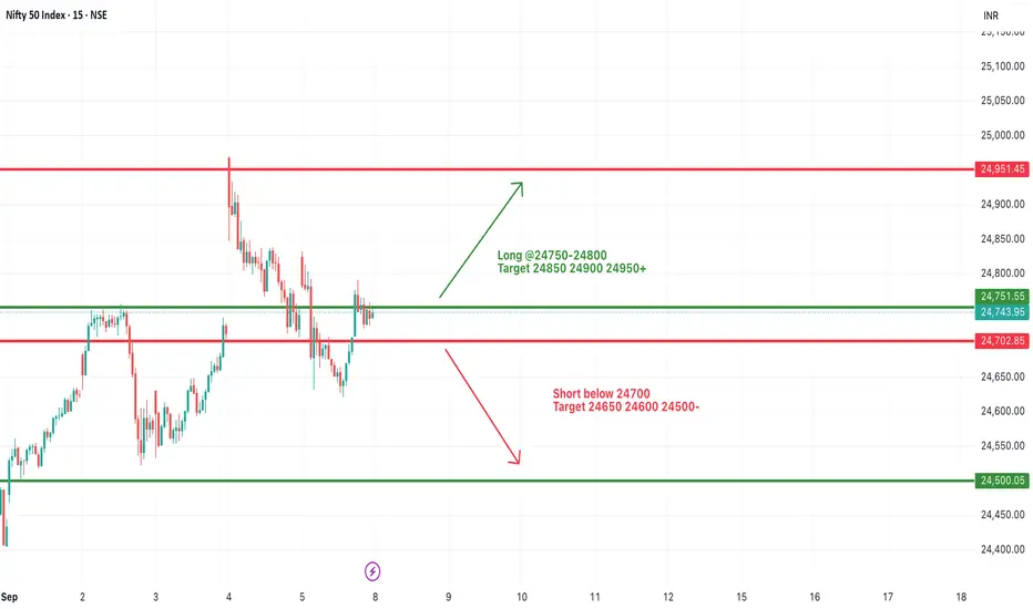 On the upside, strength may build if Nifty sustains above 24,750–24,800. A successful move above this zone can trigger a rally toward 24,850, 24,900, and 24,950+. If momentum continues, it could extend further toward the 25,000 psychological mark, strengthening the bullish outlook.