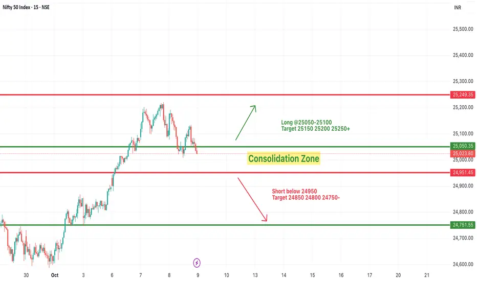 Nifty is expected to open slightly gap up near the 25,050 zone after yesterday’s mild correction. The index is currently trading within a consolidation range between 24,950 and 25,100, indicating indecision among traders ahead of a possible breakout.