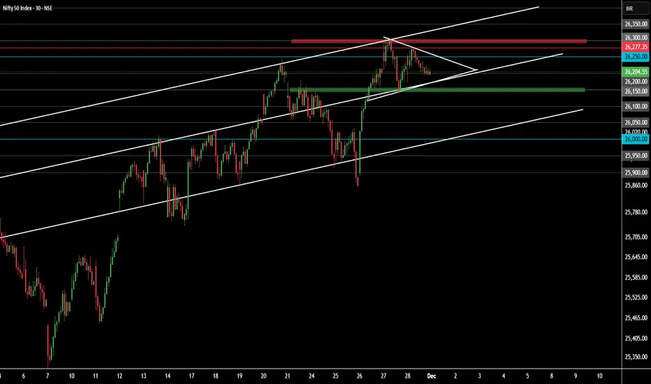 Back-2-Back 2 days red spinning tops. The two days of indecisive price movement came after a massive bullish move on 26 November 2025. So, a major consolidation is happening in the zone of 26300 - 26150. The zone is also a no-trading zone (NTZ). The view is indecisive. No long and no short. Friday's candle is a perfect inside candle and a spinning top. No bullish trade till 26300 is decisively breached.