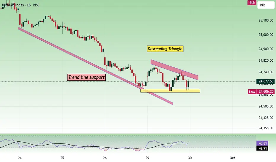 The price was holding the support at the 24600 zone and moved within the range of 24600 to 24800 today, forming a descending triangle in the process. 24600 is the trend direction deciding zone now.