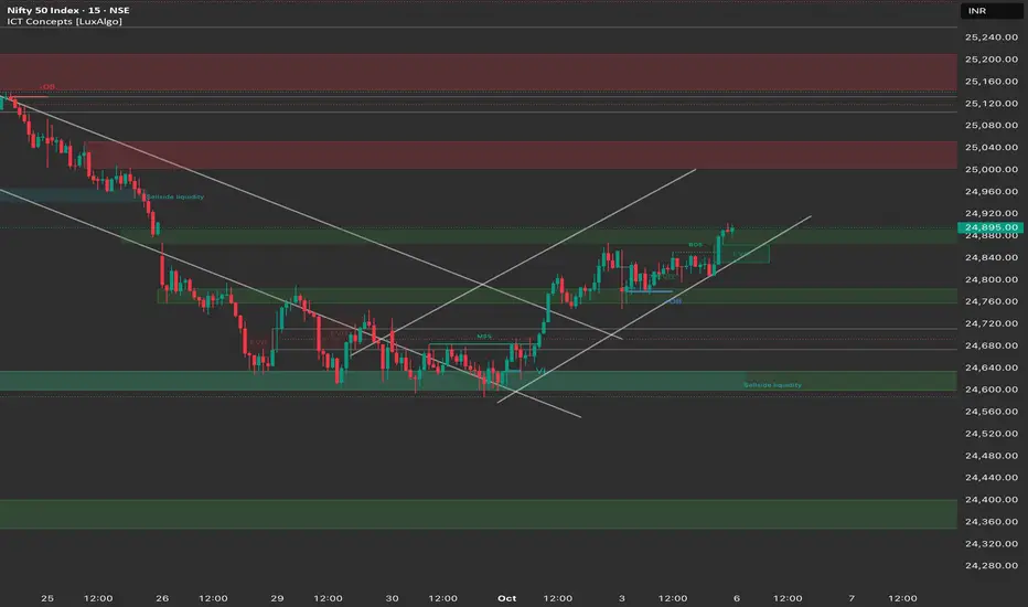 Entry: Long entry on a decisive break and 15-minute candle close above 24,950. Alternatively, look for a dip entry near 24,800 (the channel and FVG support zone).