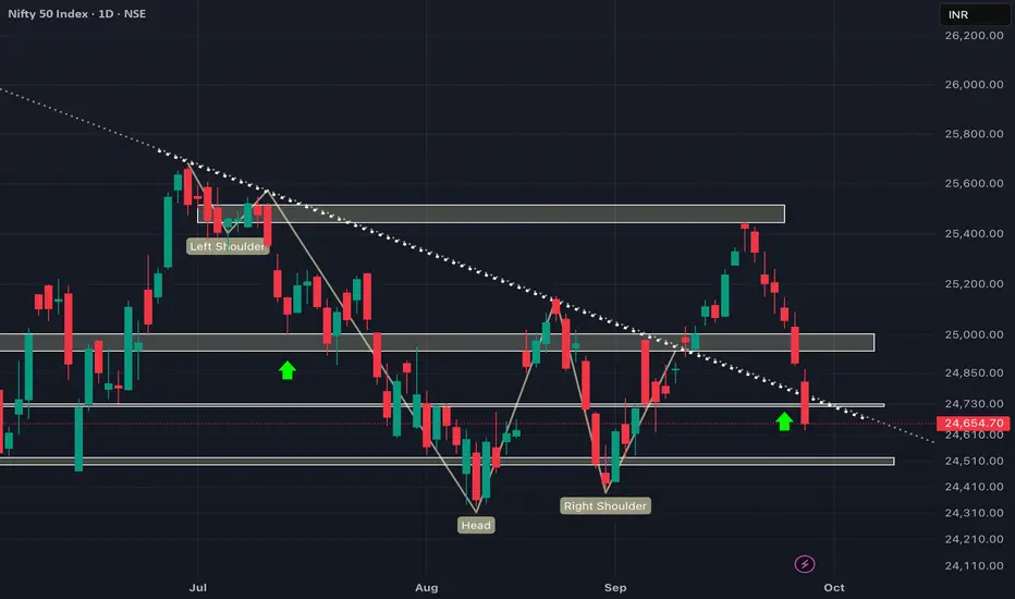 As we can see NIFTY CLOSED below our demand zone showing signs of bearishness. Despite the weakness, we may expect NIFTY to REVERSE from here as technically this zone has been conincided by multiple demand zones being both a psychological level and the neckline of inverted head and shoulders pattern which can act as an important point of REVERSAL. Hence any flat to strong opening which doesnt breaks below previous low can show strong upmove from here so plan your trades accordingly and keep watching everyone.