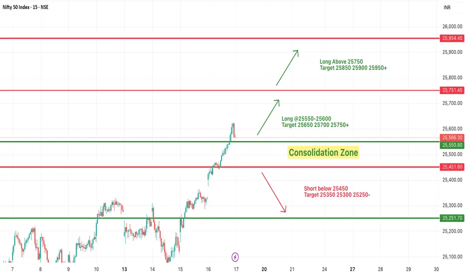 Nifty is likely to open with a gap up near the 25,550–25,600 zone, continuing the strong bullish momentum from the previous session. The index has broken out of its recent consolidation zone, indicating buyer strength and potential continuation toward higher levels.