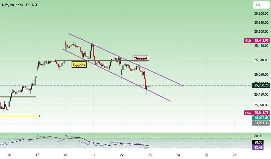 Price faced resistance around the 25300 - 25320 zone and fall down. Next nearby support is seen at 25080 as per the one-hour chart.