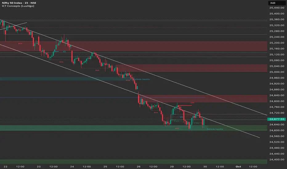 Structure: The Nifty is deep in a corrective phase, having broken the major 25,050 - 25,100 demand zone. The price is now trading at the lower boundary of a steep descending channel and sitting on a key demand zone at 24,600 - 24,700.