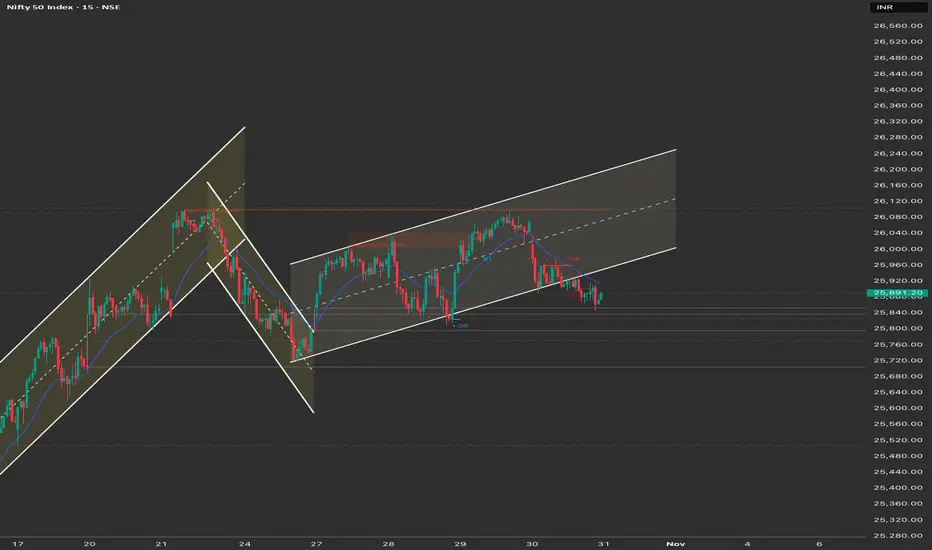 Entry: Short entry on a decisive break and 15-minute candle close below 25,750. Alternatively, short a retest and rejection of the 25,950 level (upper channel/FVG).
