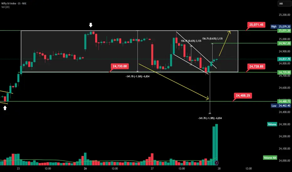 This is a **15-min intraday chart of Nifty 50 Index**, showing a **channel and retest**, followed by a potential **pullback setup** within a rectangle consolidation range.
