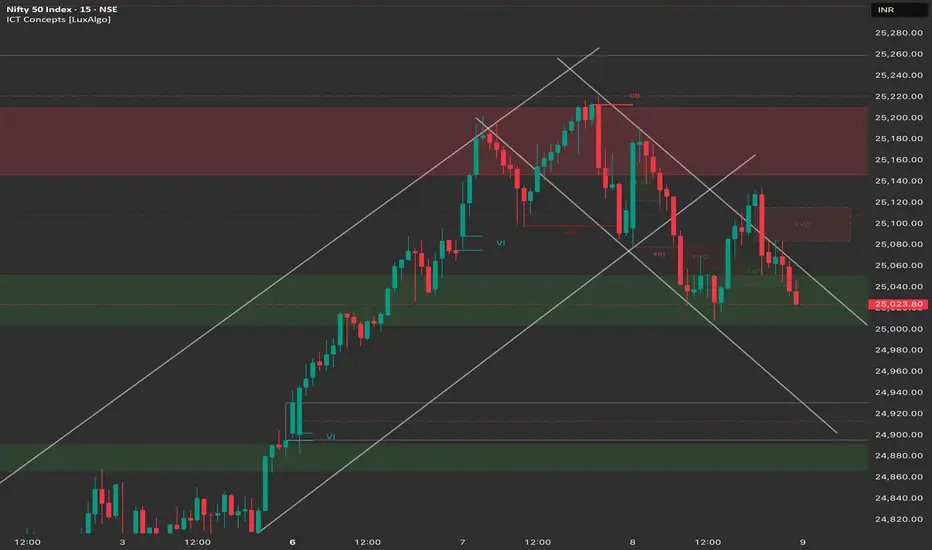 Structure: The 15M chart shows a clean descending pattern since the 25,200 high, marked by lower highs and lower lows. The market closed below the 25,050 mark, indicating bears are in control.