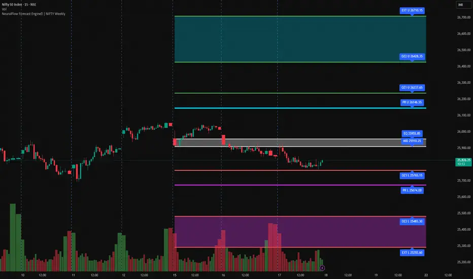 This chart shows weekly NeuralFlow AI bands plotted on a 15-minute NIFTY chart. These are contextual levels, not signals, designed to define where price matters as the week progresses.