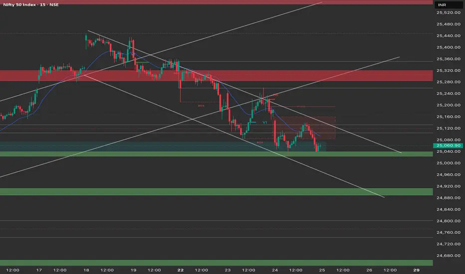 Structure: The 1H chart shows a clear continuation of the MSS (Market Structure Shift) to the downside. The index is trading within a descending channel and consistently making lower highs and lower lows. The close at 25,060 is a significant test of the support.