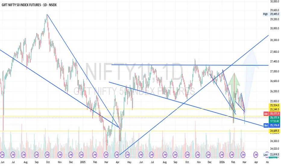 Gift Nifty Futures appears to be shaping into a falling wedge pattern — a structure often watched for potential bullish reversals.